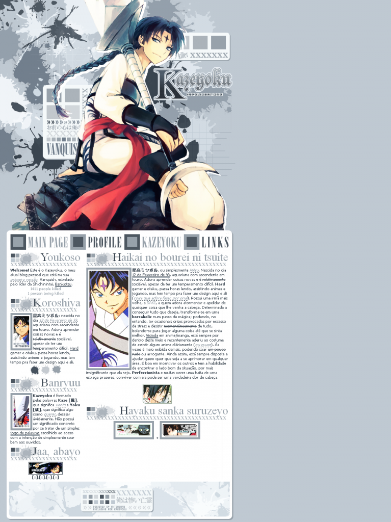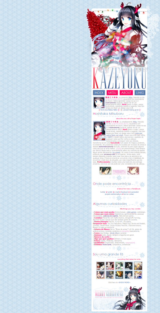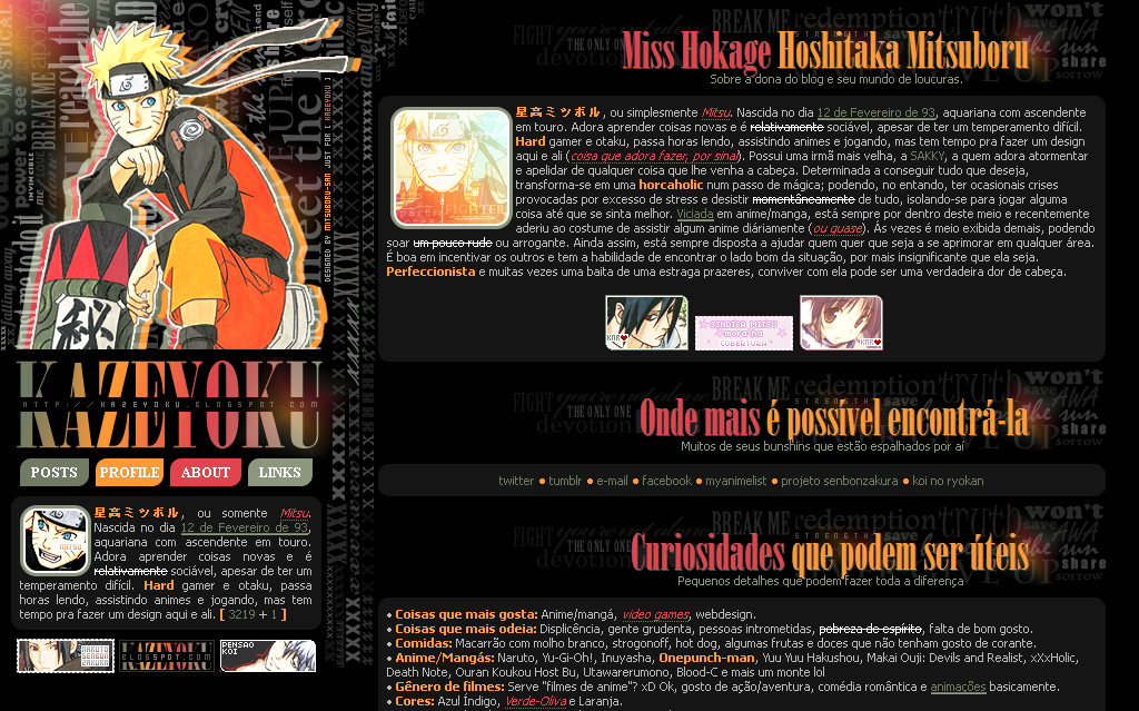 Viciada em anime/manga, está sempre por dentro deste meio e recentemente aderiu ao costume de assistir algum anime diáriamente (